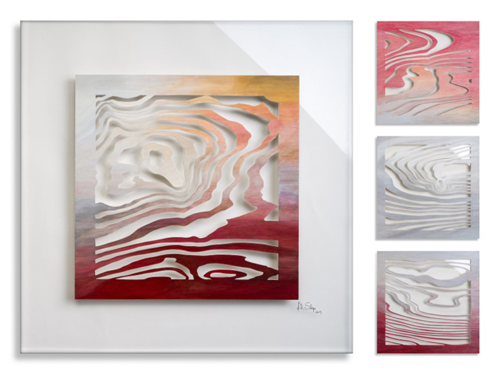 Durch meine CUTs der im Holz vorgefundenen Maserungen sieht man die sehr unterschiedlichen "Lebenslinien" von Bäumen - eine Vielfalt an dynamischen Strukturen, intensiviert durch Farbverläufe.